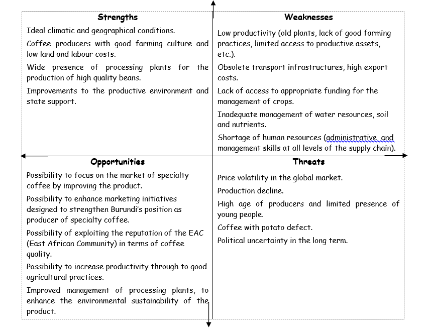 对布隆迪价值链的优势、劣势、机会和威胁(SWOT)的分析是推动适当改进战略的起点。结果如表1所示。