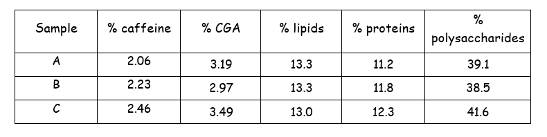 绿咖啡的一般化学成分主要取决于遗传(如物种)和生理(如成熟度)方面。本研究对来自布隆迪不同地理区域的3个FW [YY]咖啡样品,分析了对杯中咖啡影响较大的重要物理因素(密度和水分含量)和化学成分(咖啡因、绿原酸、脂类、蛋白质和多糖):2018年收获的基特加(样本A)、卡扬扎(样本B)和恩戈齐(样本C)。将结果与文献(11,12)中给出的范围进行比较,总结为: