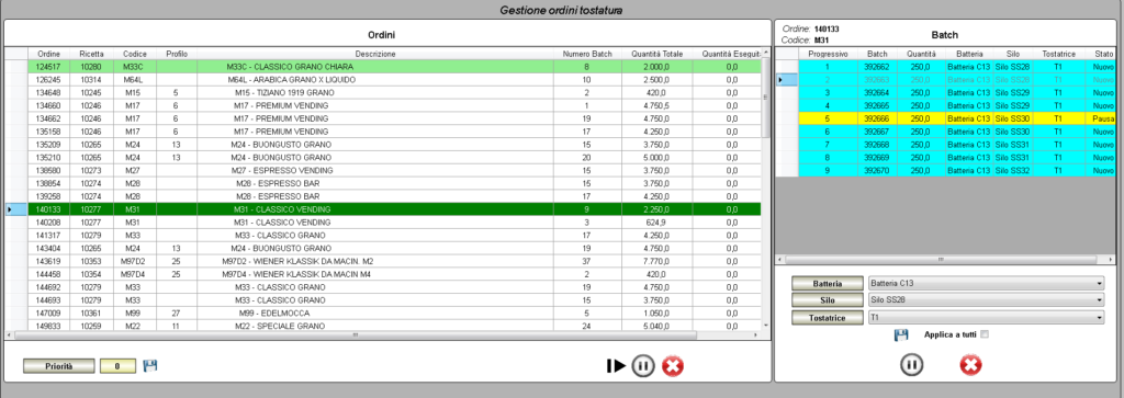 Brambati旁边,Brambati开发了一个接口,可从ERP,SAP,ME等上层接收生产订单,绿色咖啡和其他数据,并将它们提供给不同的区域和机器(咖啡烘焙机,磨刀器等)),从而需要操作员输入的最小数据。系统实时收集数据从生产中并将其存储在数据库中。