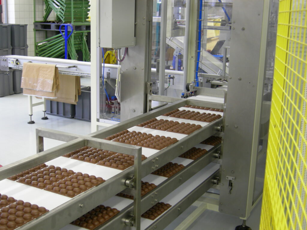 一旦脱离一次包装,就像其他市场通常发生的那样,二次包装的类型决定了以下附件和运输系统的选择:鸡蛋和果仁通常被包装在垂直的流动包装中,需要简单的夹具和升降机,其他类型的巧克力被放在托盘中,在盒子里或盒子里,需要挑选和放置系统,可能有机器人视觉,在这种情况下,往往有分隔系统。
