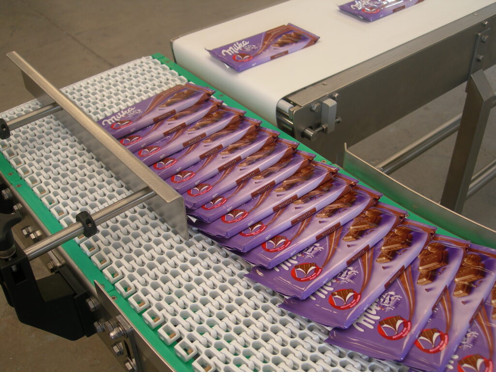 小平底巧克力,传送带与chicane系统是去的选择,它调整和分配产品的各种包装机。对于巧克力棒和一般的巧克力棒,采用经典的线送料系统,既可以装入包装机,也可以装入流包。对于所有这些系统,都可以创建缓冲区或存储系统。在散装进料系统的情况下,这只是一个问题,有足够的空间可用的传送带方面,以保持流通所需的产品体积。