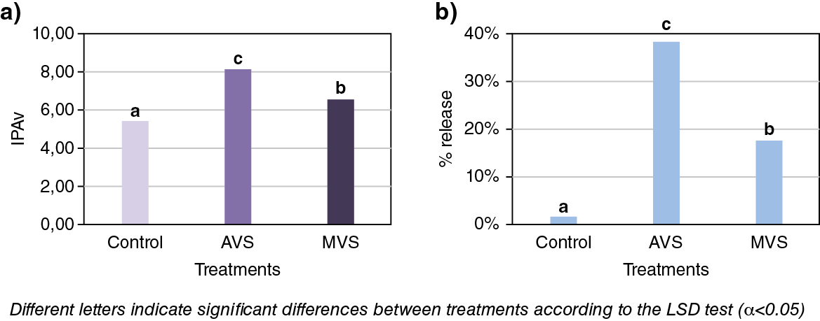 与对照相比,处理葡萄的IPAV值明显高于AVS处理的MV(图1A)。关于挥发性解放,AVS葡萄酒在发酵过程中释放了大部分挥发性化合物(图1B)。
