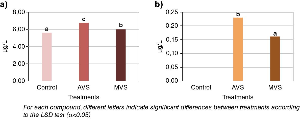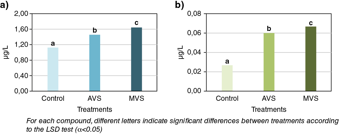 与对照组化合物(图2)在处理过的葡萄酒中更浓缩。在MVS葡萄酒中,β-达摩酮(图2A)和β-离子(图2B)的含量明显高于AST葡萄酒。