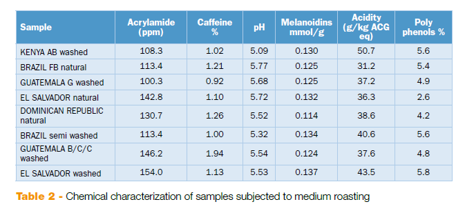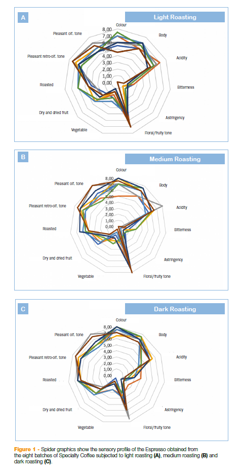 在对感官分析的结果进行第一次统计分析后,不同描述符获得的分数允许将不同的浓缩咖啡分为三组,由均匀的烘焙咖啡组成:这是强烈热处理的化学转化对杯子的强烈影响的证据。从蜘蛛图(图1)可以看出,在烘焙咖啡中,影响较小的过程(轻-图1)。a -和中-图1。B -),使样本间的差异最大化。这可以从一些关键指标的分数分散来看,如酸度、淡咖啡中的蔬菜和烘焙,以及中等烘焙样品中的奶油颜色强度、身体、酸度和坚果。