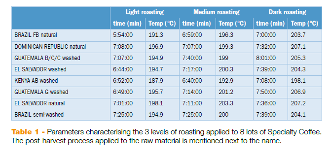 在检查了常规的化学/物理参数和绿色样品上的物理缺陷后,使用传统的6公斤鼓式焙烧机进行了三种焙烧水平(浅、中、深)的焙烧,它们只在第一个裂纹后的发展阶段持续时间上存在差异,因此在最终的温度、颜色和时间上也存在差异(表1)。