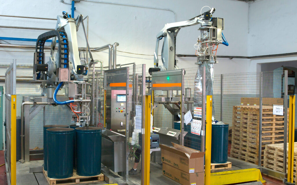 IFT意大利将无菌袋灌装头与汽车装配线上的机械臂相结合,形成一个机器人无菌灌装机。机器人运动的灵活性允许在不需要操作者干预的情况下拉伸和填充金属桶内的袋子。