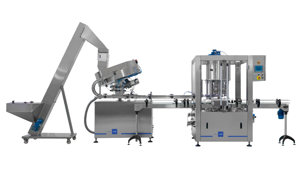 旋盖机具有连续运动和六个旋盖头Tecnofluss适用于处理不同类型的瓶盖(螺旋瓶盖、防盗瓶盖或压上瓶盖),速度达到6000pph。
