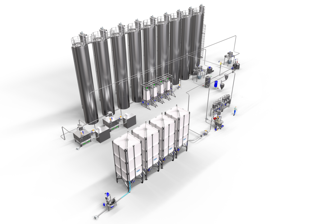 完整的生产线顺利地将小的、微观的和宏观的原料从储存库输送到计量站,操作由操作员面板管理,软件提供全面的可追溯性。在这个过程中,任何粉末、颗粒或液体的需要都可以通过设备来满足,如发酵罐、酵母熔化器、糖厂、糖转化器、面包返工溶解器、盐水生产、面粉冷却、面包和饼干废料返工系统。