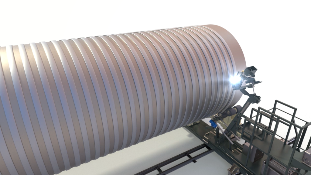 该技术实现了在罐体整体或罐体截面上直接成形、弯曲和焊接不锈钢半管的自动解决方案,只需一个操作人员。首先,成形线可以根据客户要求的半管的尺寸和形状,以及罐的直径,从盘管开始成形和弯曲型材。同时,型材焊接在罐体上,由于筒仓水平放置在电动和怠速定位器上,因此整个过程可以在连续模式下进行。